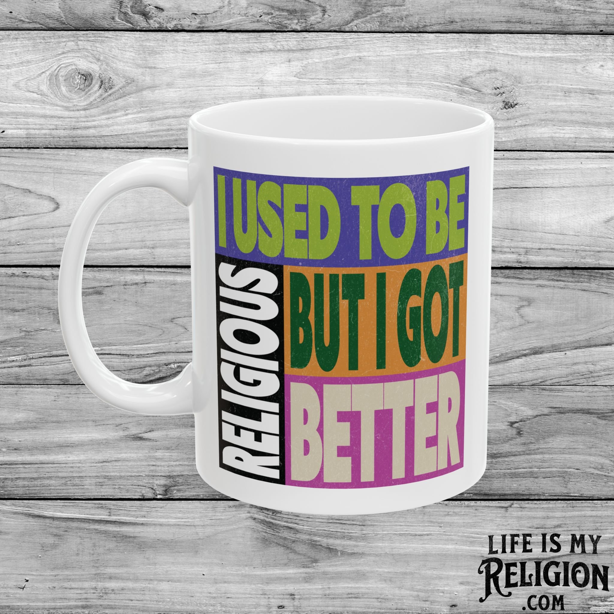 Image 1 of 3 Image 2 of 3 Image 3 of 3 I Used to Be Religious, But I Got Better - 11oz Mug $14.95 Perfect for enjoying your favorite hot beverage.Comfortable C-handleGlossy ceramic finish.Microwave-safe for convenient heating of beverages.Dishwasher-safe for easy cleaning. Quantity: Add To Cart Added! Perfect for enjoying your favorite hot beverage.Comfortable C-handleGlossy ceramic finish.Microwave-safe for convenient heating of beverages.Dishwasher-safe for easy cleaning.